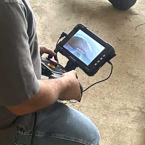 The NANO E is a compact, electrically powered milling robot that has been designed for in-house use and 3" to 4" diameter lines. It navigates and mills in 90° bends, even lined pipes. A 7” monitor displays the work on a console that has joystick controls.
